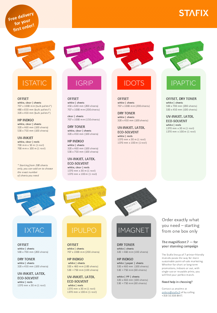 Order free Stafix product samples and discover the sustainable future of self-adhesive POS materials. Our products were developed to supercharge your campaigns.