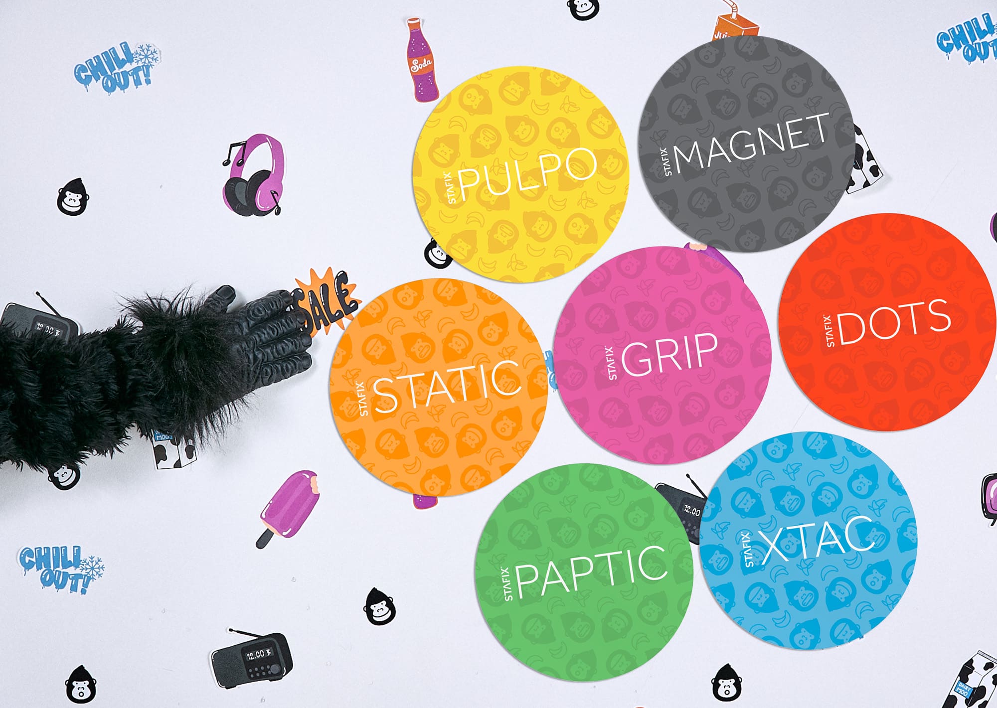 Stafixilla on myymälämainontaan täysi 7 tuotteen värisuora: STATIC, GRIP, DOTS, PAPTIC, XTAC, PULPO ja MAGNET. Kaikkien tuotteidemme suunnittelua ovat ohjanneet samat arvot ja periaatteet: korkea laatu, käytön helppous ja tinkimätön ympäristöystävällisyys.